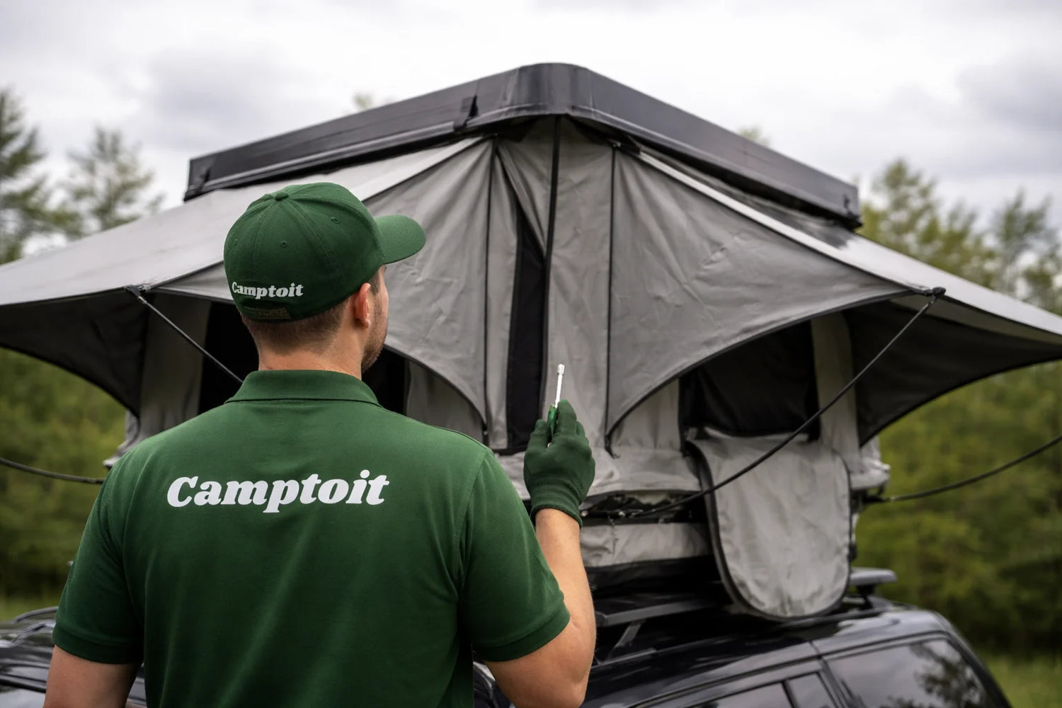 Sur cette image, notre technicien vérifie l’installation de la tente de toit Camptoit, conçue pour s’installer rapidement sur votre véhicule sans complexité. Grâce à sa structure en alliage haute résistance et son système d’ouverture semi-automatique hydraulique, la tente se déploie en quelques secondes seulement.